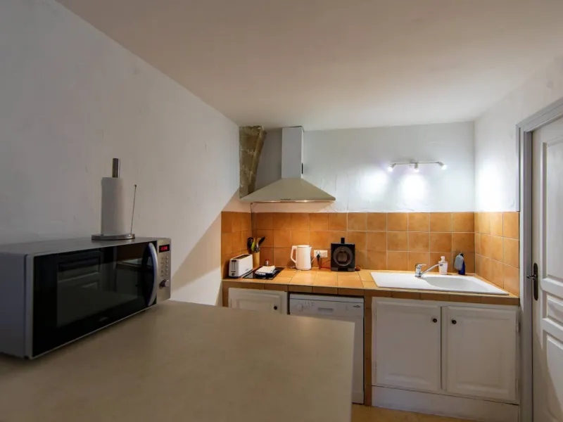 Cuisine équipée : plaque vitrocéramique – four micro-ondes avec fonction four – frigo avec congélateur – lave-vaisselle - cafetière Dolce Gusto – bouilloire – grille-pain